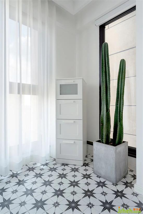 水泥盆質(zhì)感的綠植生機(jī)勃勃,旁邊窗戶選用了不占空間的百葉簾。