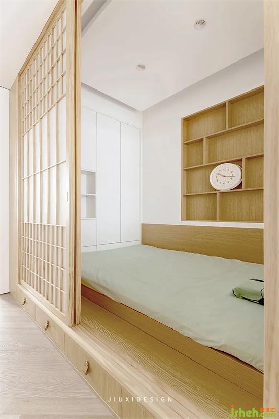 這是孩子休息的區(qū)域,房間雖然不大,但功能比較齊全。兩個格柵移門,方便活動推拉,。床下也是收納的空間,最外面的踏步室內(nèi)設(shè)計下面還有抽屜。