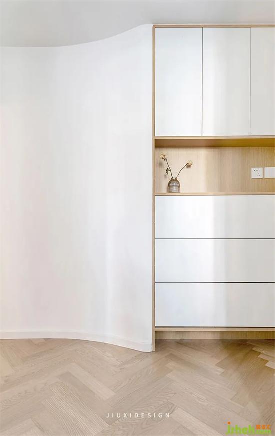 弧形墻體擋住了鞋柜的側(cè)面,裝修設(shè)計利用這個優(yōu)點,完美的嵌入了一面超薄鞋柜,解決了原來入戶沒有鞋柜的窘境。