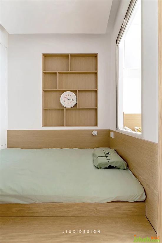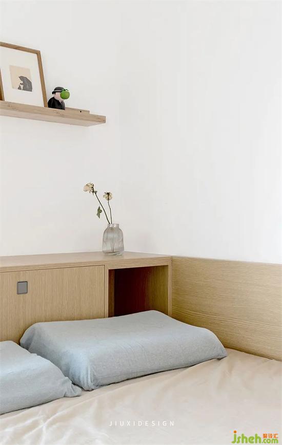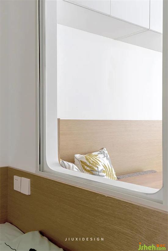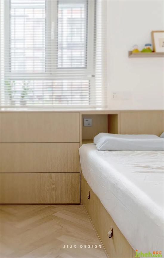臥室的床頭做成一組柜子,裝修設(shè)計具備收納,也加寬了窗臺,有一種飄窗的感覺。