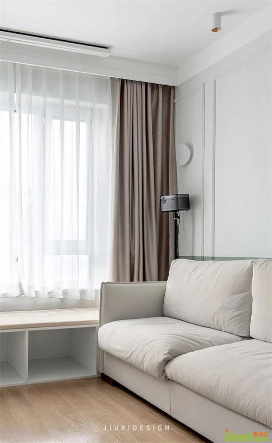 客廳作為備用臥室,選擇了一款淺色的沙發(fā)床,來(lái)客人時(shí)輕輕拉開(kāi)就切換成一張舒適的床。