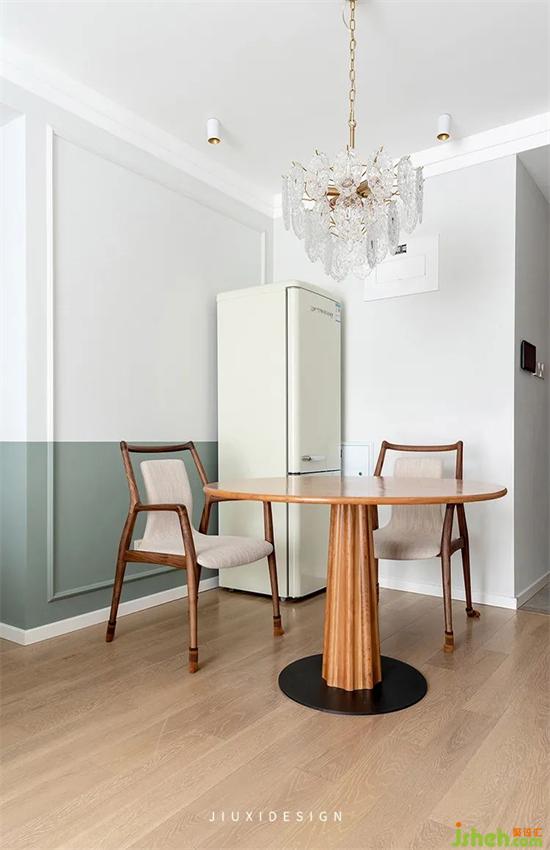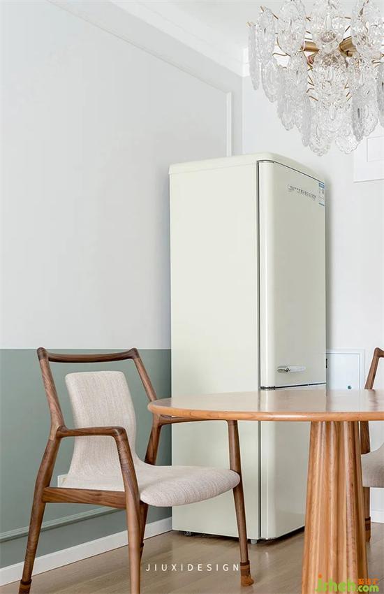 餐廳與客廳的造型相呼應(yīng),胡桃木質(zhì)的餐桌椅,搭配水晶吊燈和奶油色的小冰箱,透露出家的輕松。