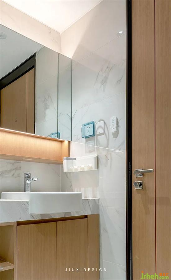 為了滿足洗臉池附近的收納,設(shè)置了鏡柜與常用的牙刷收納。裝修設(shè)計(jì)做了開放式和封閉式的區(qū)分,常用的就直接放置在外面待用。