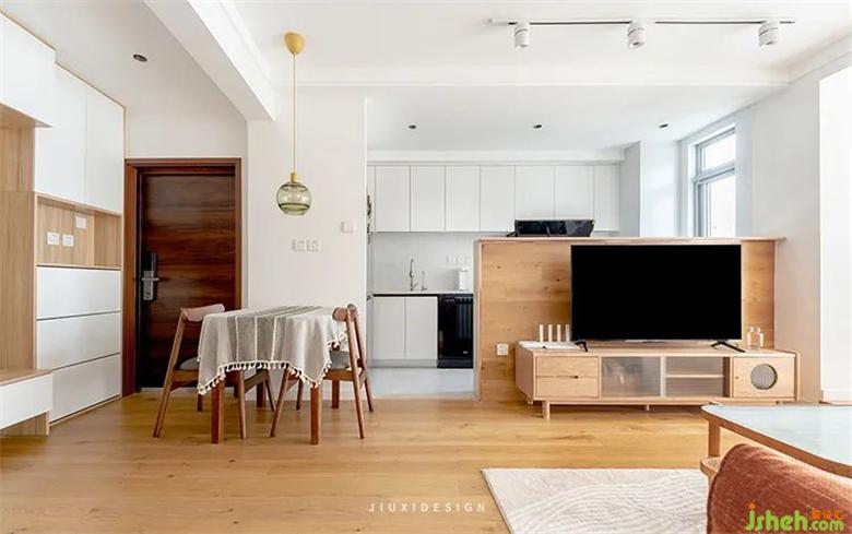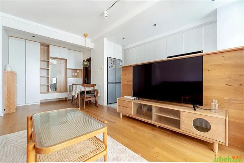 廚房與客廳之間的格局打開后,電視背景墻采用了木地板上墻的拼接方式,讓墻面與地面形成一個整體。