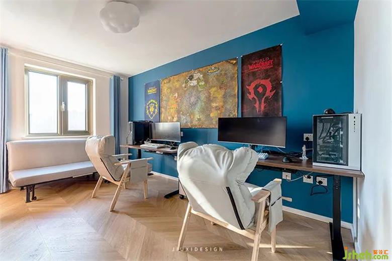 游戲房是充滿競技的地方,男女主人雙排設(shè)置,可以共同奔赴戰(zhàn)場。房內(nèi)的深藍(lán)色墻漆,結(jié)合超長的木色升降桌,給屋主打造一處,共同游戲的夢想空間。生活不僅需要溫度,復(fù)式裝修設(shè)計(jì)更需要潮玩的態(tài)度。