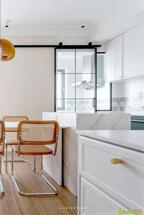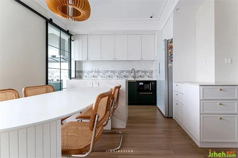干凈素雅的白色餐桌,復(fù)古又簡潔的餐邊柜和西廚,室內(nèi)設(shè)計師搭配頂部精致的石膏線條和低垂的南瓜燈,營造出溫和浪漫的用餐氛圍,讓宅家的每一餐,都有滿滿的儀式感。