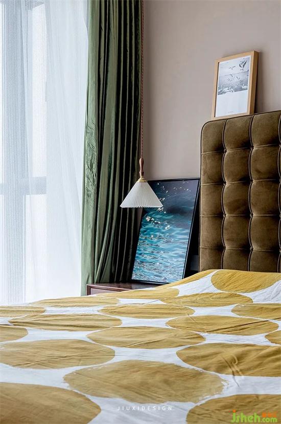 主臥布萊肯棕背景搭配墨綠色窗簾,低調(diào)又不失柔美。再配以飄逸的紗簾,給予人溫暖安謐的視覺感受。番茄家的黎草色方格拉扣款布藝床,與圓形暖色床品相搭配,室內(nèi)設(shè)計師打造舒適溫馨的氛圍。
