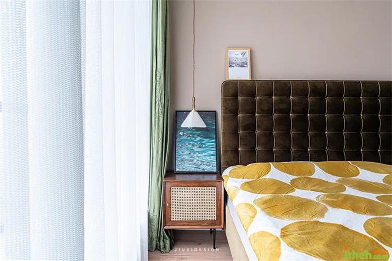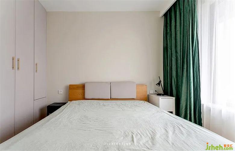 次臥強調(diào)安靜自在的舒緩感,大面積使用杏子灰,室內(nèi)設(shè)計師搭配自然氣息的復(fù)古綠窗簾。原木結(jié)合布藝的床頭混合設(shè)計,舒緩整個空間,并帶有一絲生機與從容感。