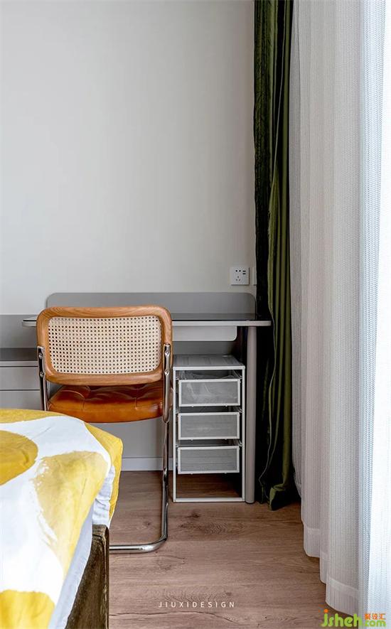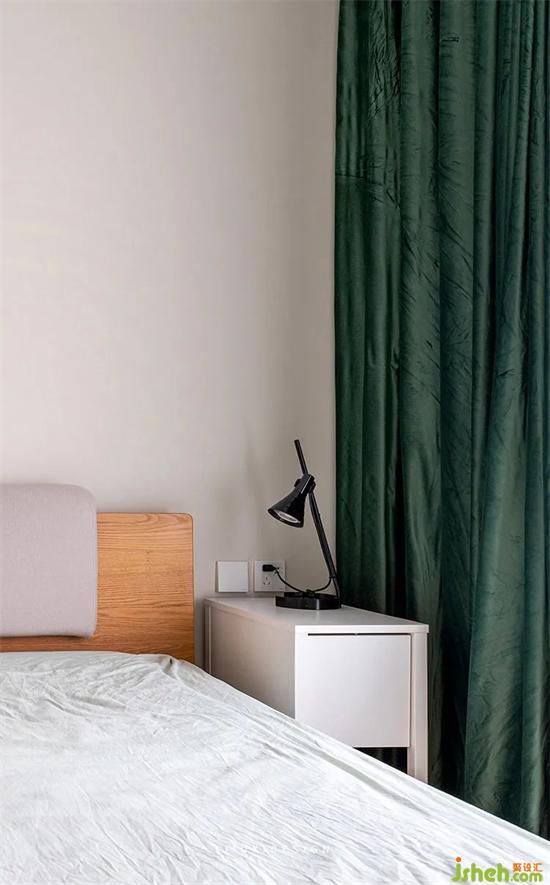 在木色床頭與復(fù)古綠窗簾之間,搭配一個小面積的白色床頭柜和黑色的小臺燈,降低顏色的沖擊感,且小巧而實用。
