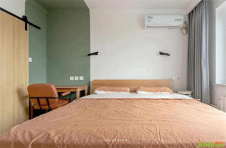 由于屋主有在家偶爾室內(nèi)設(shè)計(jì)師辦公的需求,在床頭增加了辦公區(qū),床品和椅子的配色,統(tǒng)一空間色調(diào),擁有變化還不失單調(diào)。