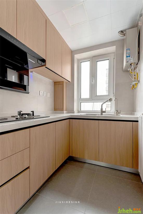廚房整體以原木和灰色磚為主,干凈整潔。室內(nèi)設(shè)計(jì)師為了達(dá)到整體結(jié)室內(nèi)設(shè)計(jì)師構(gòu)統(tǒng)一,下水也用板式家具包覆隱藏,同時(shí)預(yù)留了可以開啟的檢修口,將細(xì)節(jié)感拉滿。