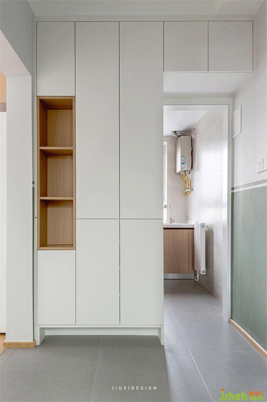 縮小廚房空間,新增加的玄關(guān)儲(chǔ)物柜,滿足日常的食用儲(chǔ)備。原來在廚房暴露出來,縱橫交錯(cuò)的一堆室內(nèi)設(shè)計(jì)師管道,正好可以通過玄關(guān)柜將其全部隱藏。