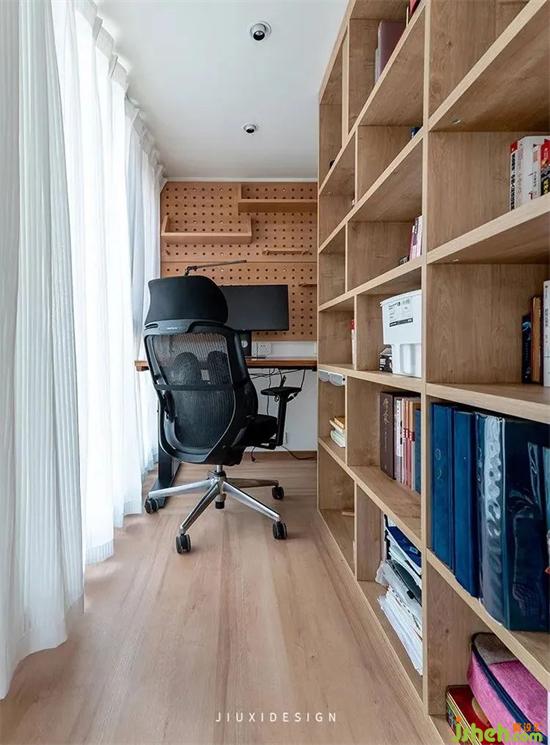 2米的滿墻超大書柜,搭配墻面的洞洞板,裝修設(shè)計(jì)讓不大的空間,擁有海量儲(chǔ)物能力,滿足了is的書房夢。