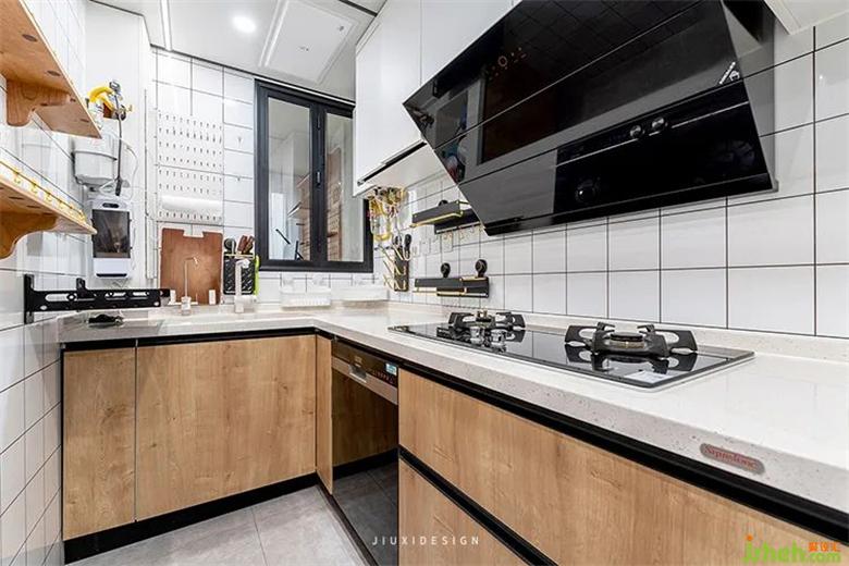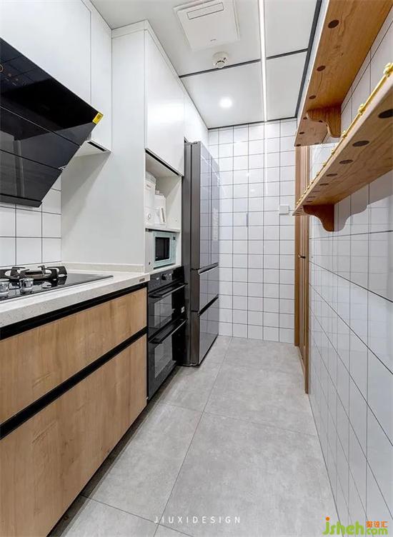 讓出陽臺(tái)的廚房,弱化了動(dòng)線的狹長感,裝修設(shè)計(jì)將門改造成室內(nèi)窗,保留了原有的采光與通風(fēng)效果。