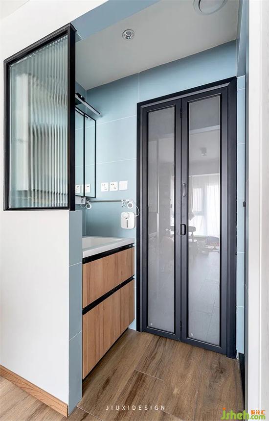 洗漱區(qū)挪移到了衛(wèi)生間門外,半墻+長虹玻璃隔斷的組合,既可以形成遮擋,又不會(huì)遮擋采光。