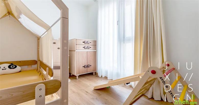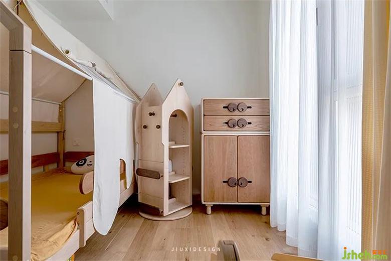 兒童床右側(cè)是玩具柜和小型衣柜。培養(yǎng)寶寶自主收納和動(dòng)手能力。所有家具都是選用等等幾木,裝修設(shè)計(jì)材料質(zhì)感確實(shí)很好,安全系數(shù)高用著放心。