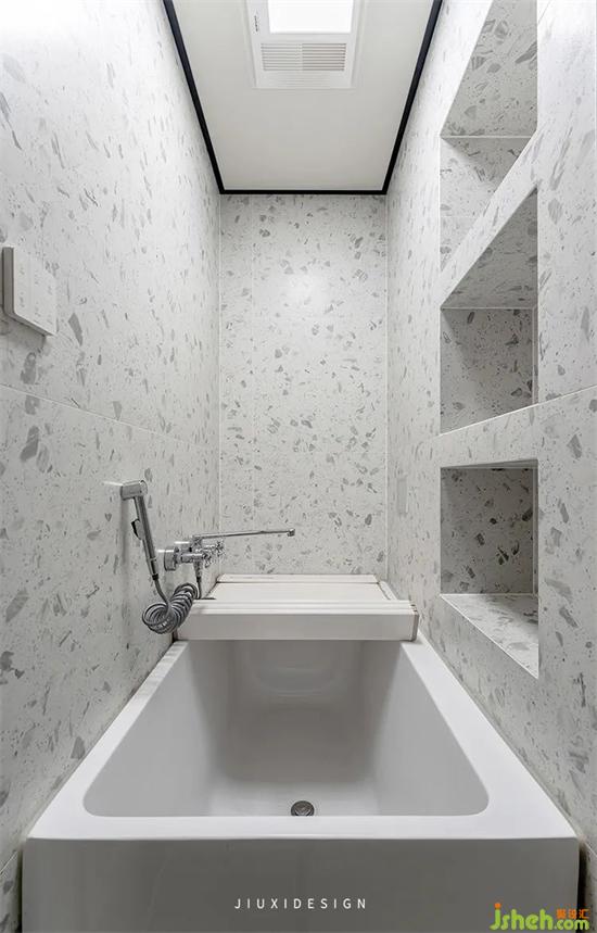 浴缸右側(cè)還利用管道延伸做了壁龕,日常存放洗浴用品拿取更加方便。長1.3m寬75cm的浴缸,上面還加裝了抽拉式的蓋子。不僅可以防止落灰,還能當(dāng)作置物架,可以邊泡澡邊追劇。
