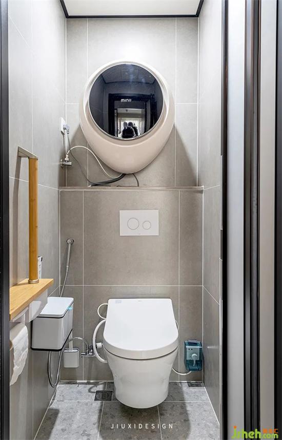 衛(wèi)生間擁有自己獨(dú)立的如廁空間,隱藏式水箱壁掛馬桶節(jié)省更多空間,并在上面安裝了minij小吉的壁掛式洗衣機(jī),讓寶寶和大人的衣物可以分開清洗。