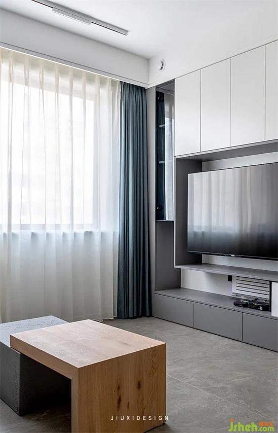 整個(gè)客廳與餐廳合為一體,互相融合。整面的柜子隱藏了餐桌和主臥的門,使整個(gè)空間連貫一體,大氣整齊。從色彩和氛圍的營(yíng)造上,我們選用了低飽和度及大量的中性灰色,去覆蓋空間。營(yíng)造出一種整潔,冷靜的高室內(nèi)設(shè)計(jì)級(jí)感。