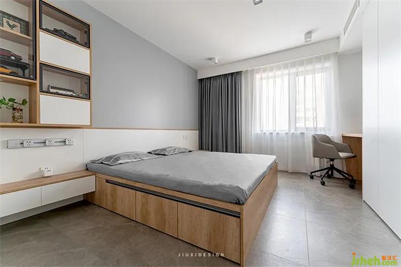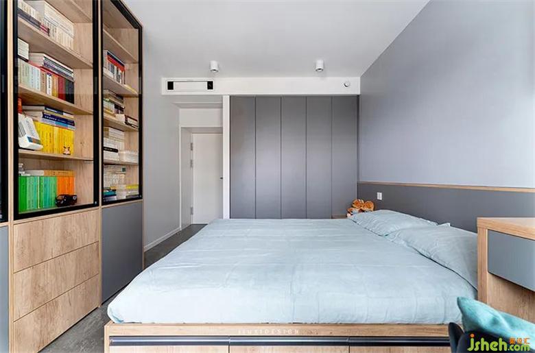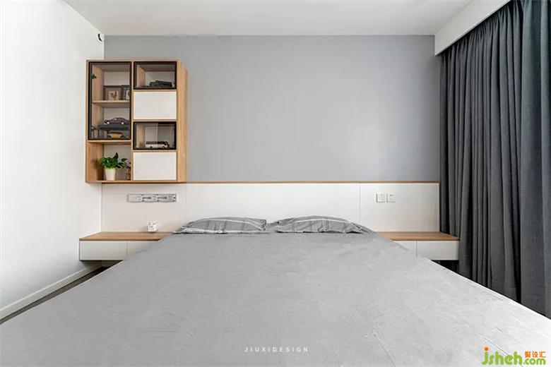 主臥沒(méi)有多余的裝飾,極簡(jiǎn)的墻面、衣柜和無(wú)靠背床都非常符合簡(jiǎn)約的調(diào)性。空間中既有俐落平衡的線條,冷靜的灰色,也有紋理自然的木紋,室內(nèi)設(shè)計(jì)為空間中和溫度。增加自然質(zhì)感,視覺(jué)上也得到了平衡和安室內(nèi)設(shè)計(jì)定。
