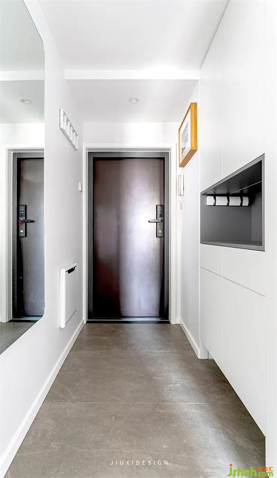 入戶的位置規(guī)劃了換鞋凳,掛衣區(qū),鏡子和鞋柜位置。鞋柜區(qū)域預(yù)留了開(kāi)放格和抽屜,放置小件物品,同時(shí)也可以處理不用扔掉的口罩。室內(nèi)設(shè)計(jì)整體色調(diào)通過(guò)明朗色塊的墻頂和地分開(kāi),形成明暗變化。走進(jìn)入戶空間的第一感,一種簡(jiǎn)約舒適感迎面而來(lái)。