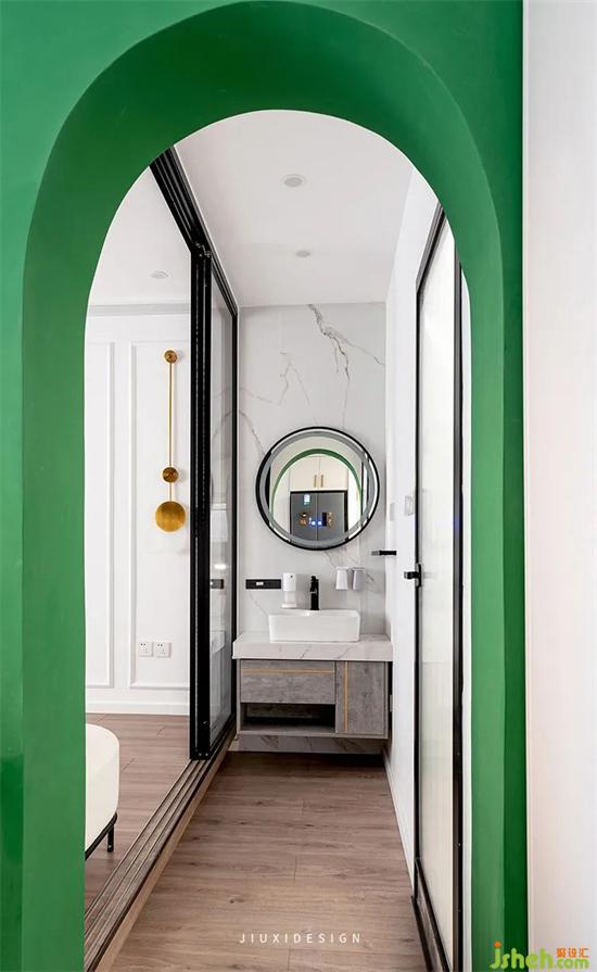 圓拱形門洞,讓層高有了向上的效果。墨綠色奠定了動線的協(xié)調(diào)感,裝修設(shè)計增添復(fù)古時尚的韻味。