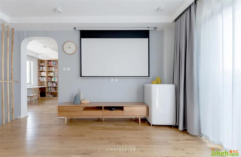 電視墻頂面暗藏了投影幕布,在家就可以享受精彩美妙的大片。從客廳望向書房,視線室內(nèi)裝修自由,開敞通透。在弧形的門洞下,是對另一個空間的互動與溫柔表達(dá)。