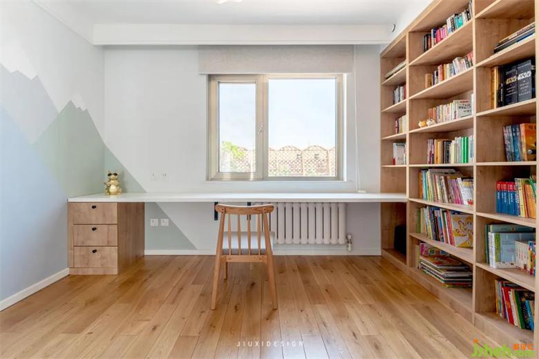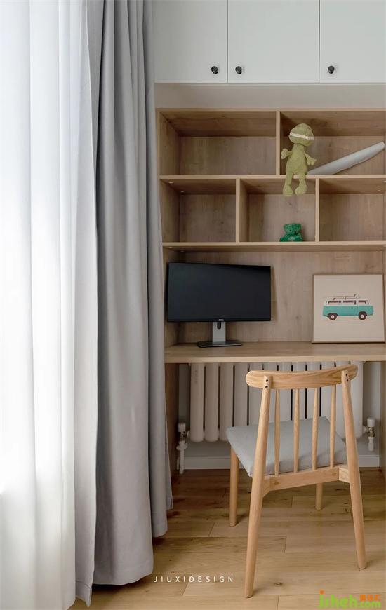 盡管孩子還小,但是他的獨立學(xué)習(xí)空間,要提前歸置好,從小培養(yǎng)他的獨立能力和學(xué)習(xí)能力。書柜設(shè)置有藏有露,實用且不凌亂。