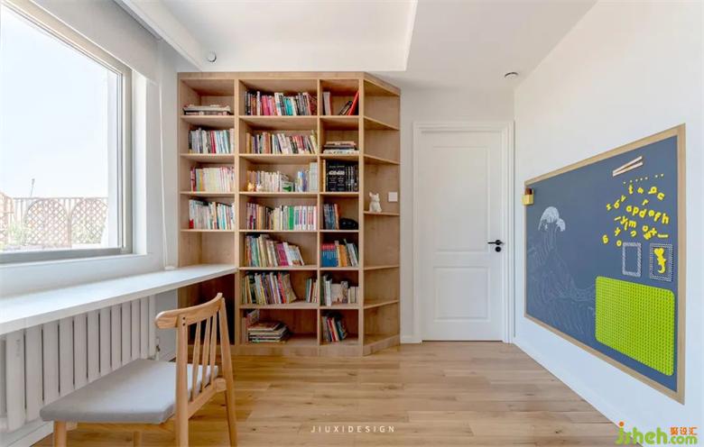 開放式書房可以隨時與孩子,在這里享受與親子共處的時光。原木色的書柜搭配白色書桌,簡潔而溫馨??瞻讐γ嬖O(shè)置了黑板的區(qū)域,室內(nèi)裝修可以盡情釋放孩子的繪畫能力。