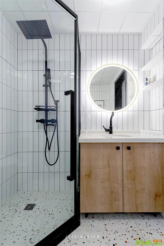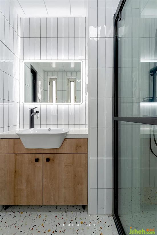 客衛(wèi)同樣做了干濕分離,浴室柜臺中盆的設計,室內裝修解決了深度尺寸太小的問題。豎向鋪貼長條小白磚,起到給小空間延伸高度的效果。壁龕滿足了淋浴區(qū)域,對洗漱用品收納。