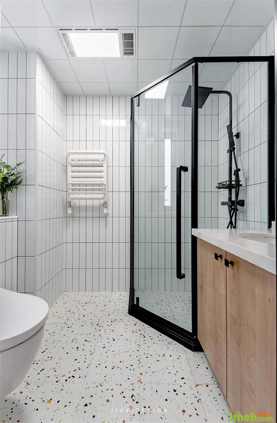鉆石型的黑色邊框淋浴房,與白色的墻面形成對比,室內裝修顯得格外高級。浴室柜旁做了單獨的收納架,方便存放洗漱用品。