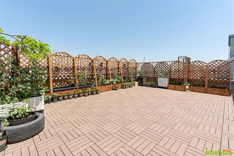 露臺地面整體鋪設了室外專用塑木地板,方便打理。露臺外側,用原木花架所包圍,美觀又安全。隨處安放的綠植和蔬菜,有一種回歸田園的味道,當然這也是戶外燒烤的絕佳之地。