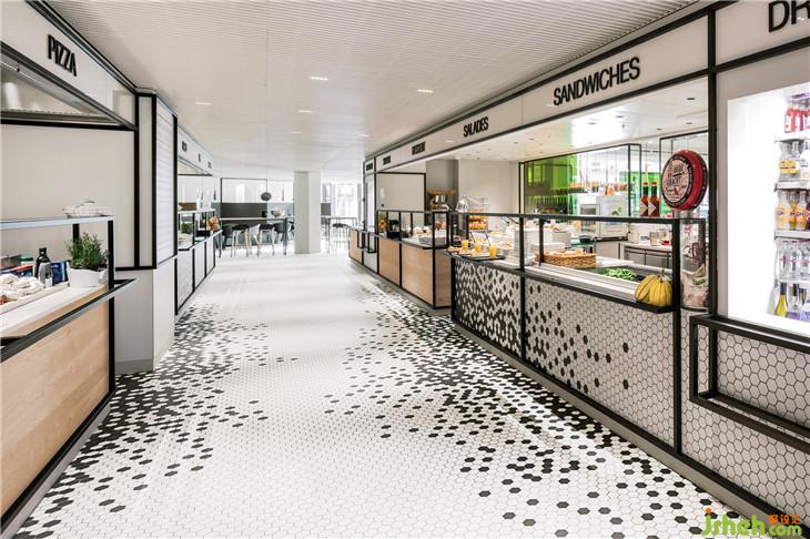 餐廳中心的開放式廚房區(qū)域是一個自助服務(wù)系統(tǒng),顧客可以在其中一個食品柜臺點餐。從百貨公司望去,現(xiàn)場烹飪和新鮮的食材吸引著顧客走進餐廳。廚房的新鮮食物在餐廳都可以看到,因為所有的隔板都是由透明的彩色玻璃櫥柜制成的。