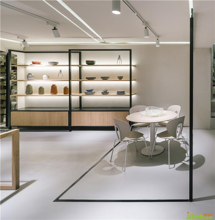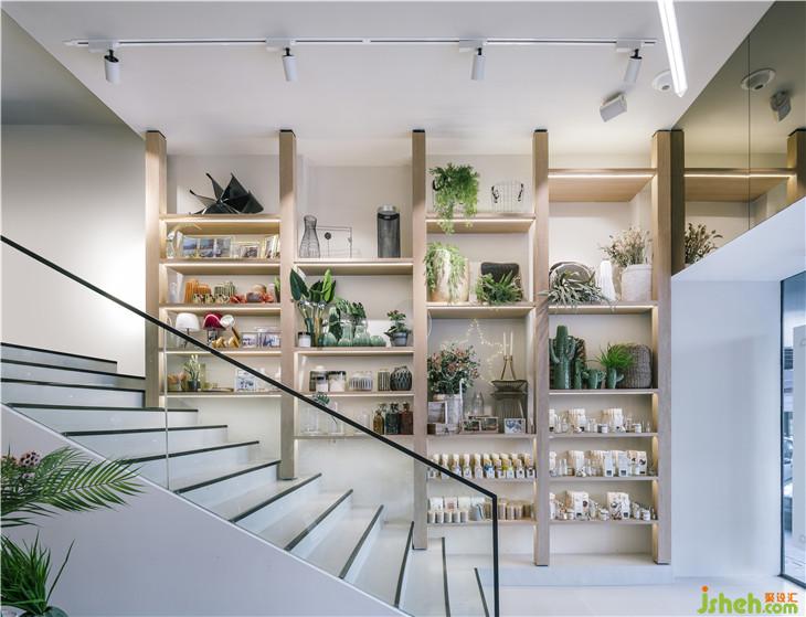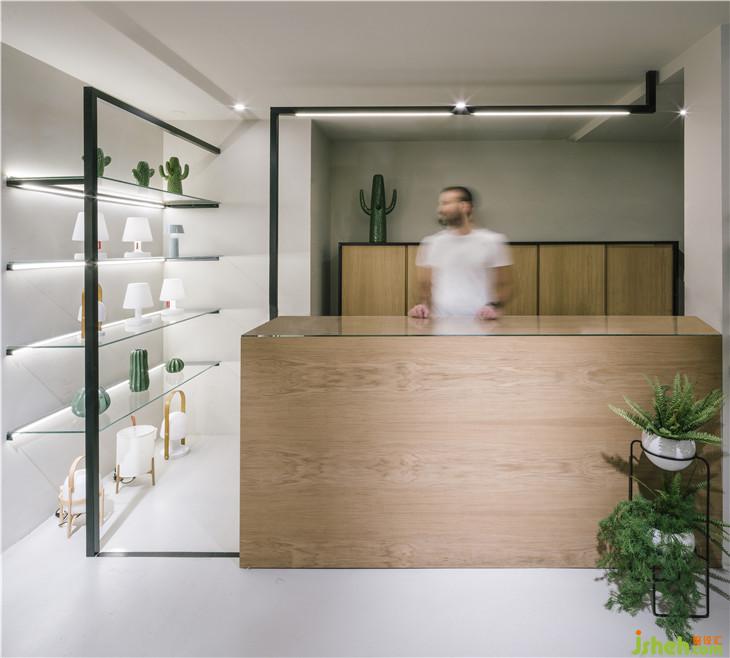 當(dāng)你一進(jìn)入室內(nèi),映入眼簾的是一個(gè)由用橡木支撐的架子。這些木制結(jié)構(gòu)以一種溫暖的方式歡迎客戶,展示了從小配件到家具的不同類型的物品的選擇。