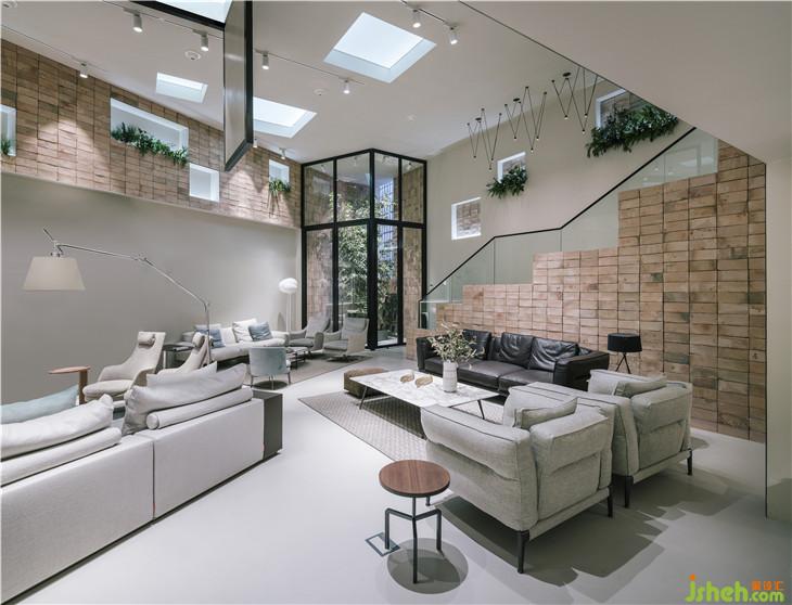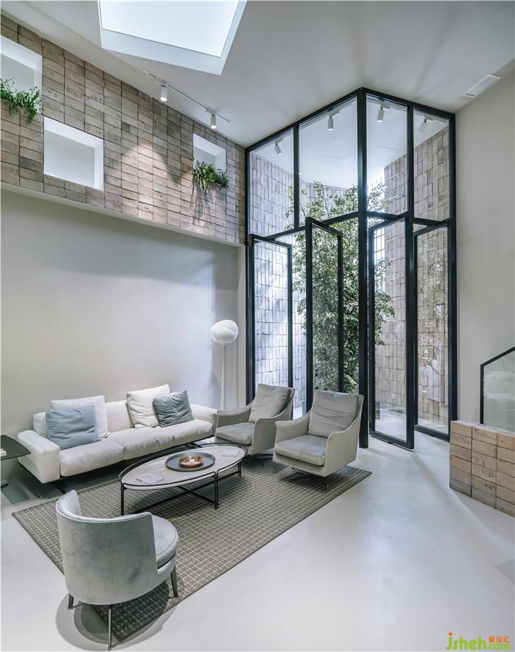 穿過(guò)這些金屬條,我們會(huì)遇到一個(gè)7m高的大空間,這個(gè)空間由鋼鐵和玻璃結(jié)構(gòu)組成,入口處設(shè)有一棵大樹,通過(guò)自然光線的照射使得入口處別有一番風(fēng)味。