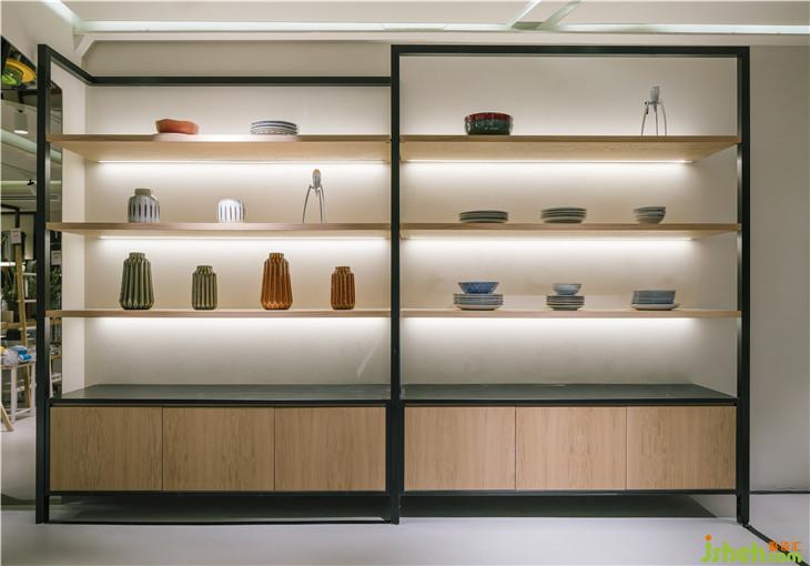 往里走,這個(gè)地方被分成兩個(gè)高度。 在這些高度內(nèi),金屬條貫穿周邊,形成木質(zhì)和玻璃擱板的支撐。