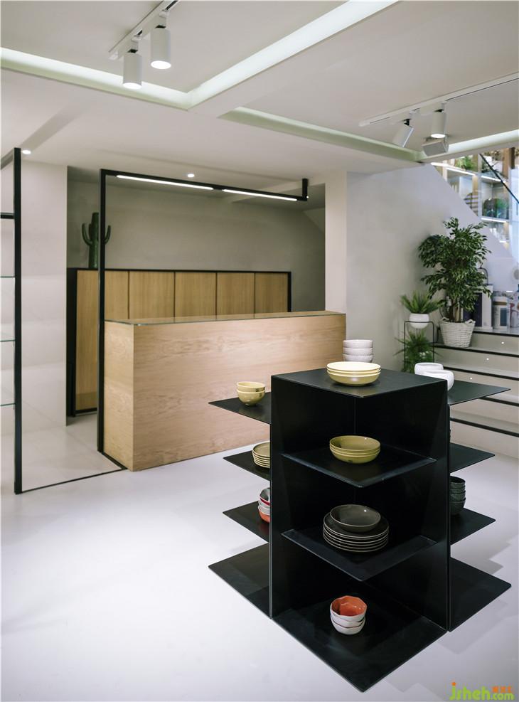 整體的重要性通過(guò)這些來(lái)展示:混凝土作為不同區(qū)域的統(tǒng)一元素,鋼材漆成黑色作為結(jié)構(gòu)元素,木質(zhì)橡木作為產(chǎn)品展示的支撐,最后玻璃和鏡子來(lái)增強(qiáng)深度和輕盈的感覺。