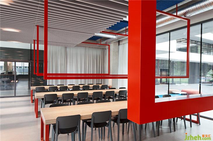 員工餐廳不僅是享用午飯的地方,又是員工之間的交流最多的地點(diǎn)之一。為營造不同風(fēng)格的就餐氛圍,餐廳布置了多人使用的大長桌、小隔間、酒吧高桌以及三人用小圓桌等不同餐位,讓員工根據(jù)自身的需求選擇就餐環(huán)境。紅色的鐵質(zhì)框架在食堂餐桌上方,在沒有任何空間障礙的情況下有效劃分空間;黃色的簡約吊燈和藍(lán)色的吊頂面板與紅色框架相呼應(yīng),為餐廳賦予一些活力。