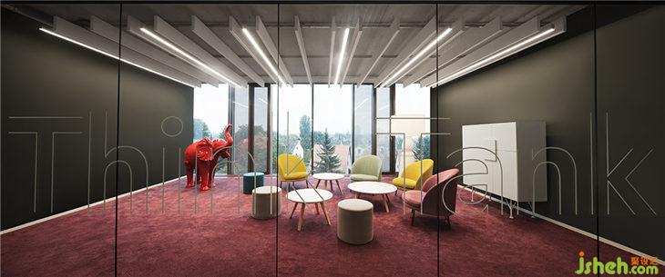 在AEB總部辦公樓,每一層都能找到促進(jìn)員工交流的公共休息區(qū)。它位于每層走廊的角落,靠近方形的中庭空間。在中庭懸垂的這些不同面積的陽臺(tái),提供了不同材質(zhì)、顏色、形狀的休閑桌椅和沙發(fā),這些家具都是可以根據(jù)使用者的交流需求和景觀需求自由移動(dòng)的。相鄰的備餐間把這些區(qū)域變成了一個(gè)可進(jìn)行非正式會(huì)議和簡短討論的交流區(qū),同時(shí)也在輔助這些功能。大膽的吊燈設(shè)計(jì)是每層陽臺(tái)最引人注目的亮點(diǎn),作為連接每個(gè)樓層的重要垂直軸線,明亮的光線為整個(gè)空間添加了出人意料的詩意。偏小和隱蔽的陽臺(tái),不同于其他開放式陽臺(tái)交流區(qū),營造一個(gè)‘前廳’的氛圍。其中的逍遙椅以及珍藏一些專業(yè)書籍的迷你圖書館,在辦公區(qū)創(chuàng)造了一個(gè)寧靜又舒服的閱讀區(qū)域,讓其他員工工作不受任何干擾。