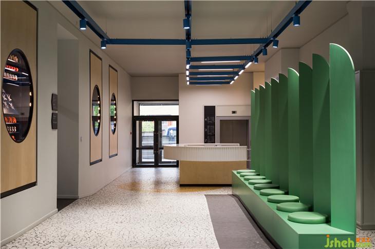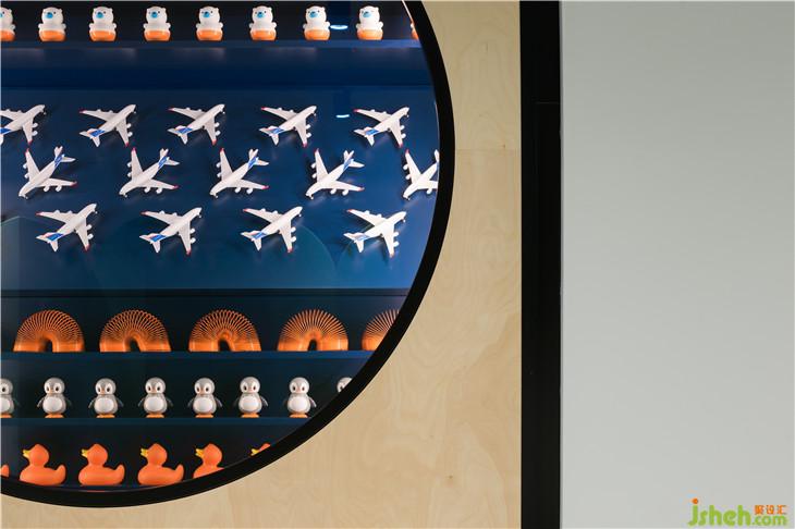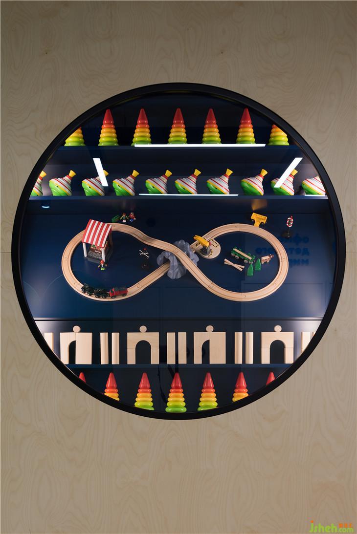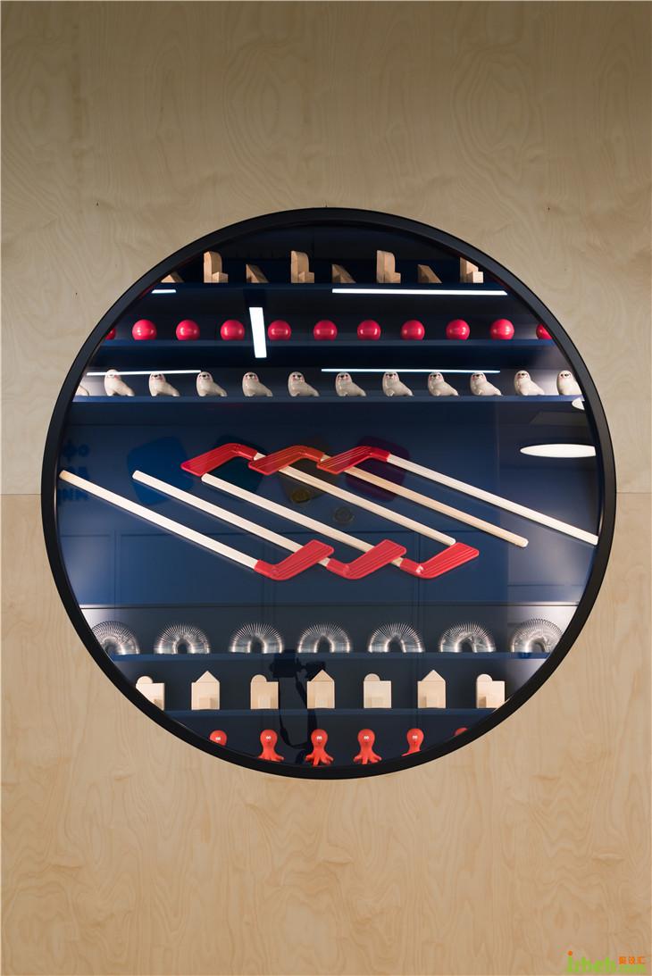 入口處墻面上的圓形展示窗口陳列著各式經(jīng)典玩具,喚起人們熟悉的記憶,同時(shí)標(biāo)識(shí)著棋盤游戲的開(kāi)始。