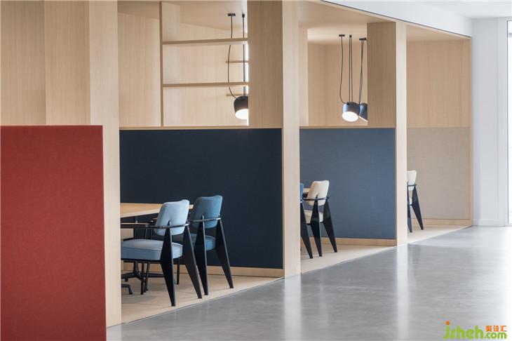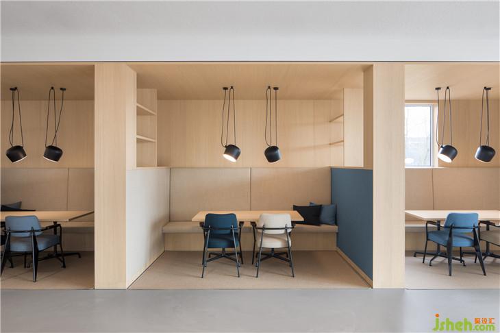定制的櫥柜和木制物品分隔開來,讓空間保持開放的狀態(tài)。我們用顏色和材料來關(guān)聯(lián)它們。一系列的會(huì)議區(qū)域由軟木材和米色面料制成,保證了完美的音響效果。