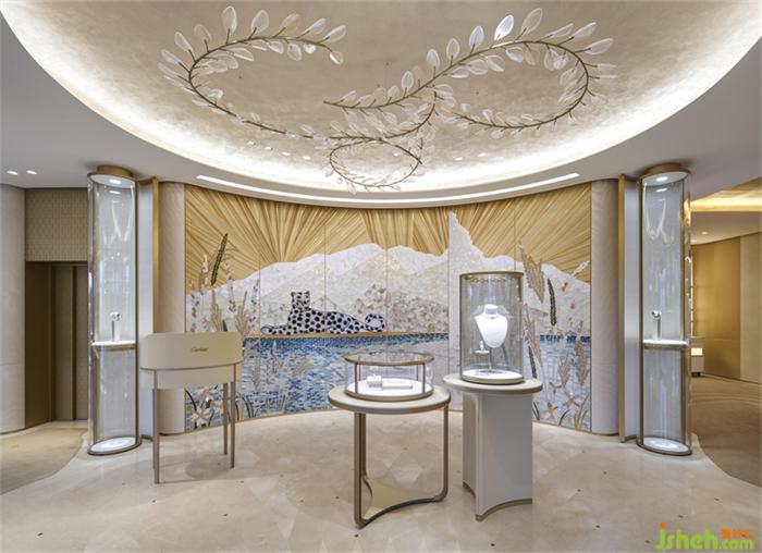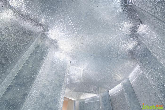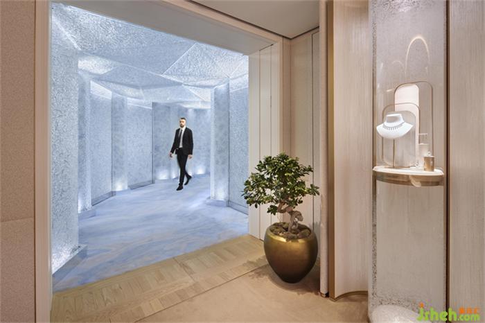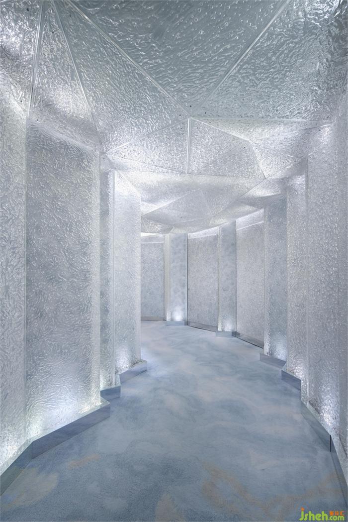 精品店的入口被水晶玻璃制作而成的冰墻所覆蓋,猶如踏入一座冰封千年的童話王國,卡地亞精品店設(shè)計(jì)不規(guī)則的天花板和墻板渾然一體,像穿梭在冰川中,凌烈卻變幻莫測。