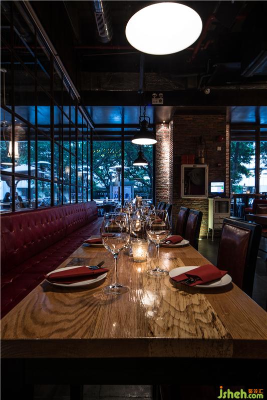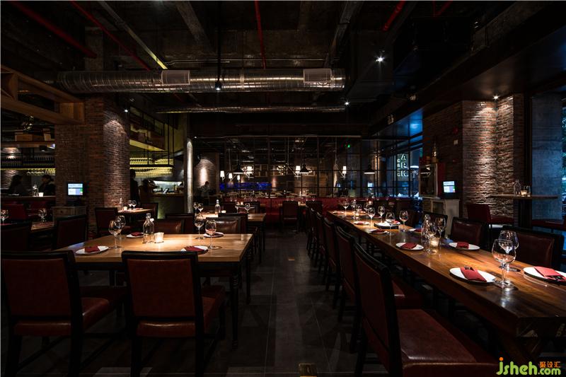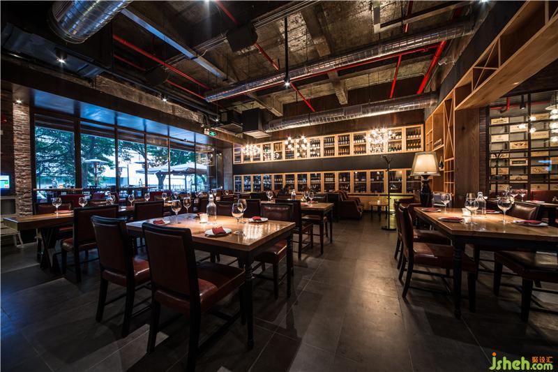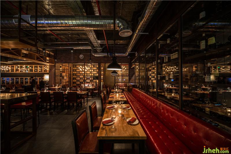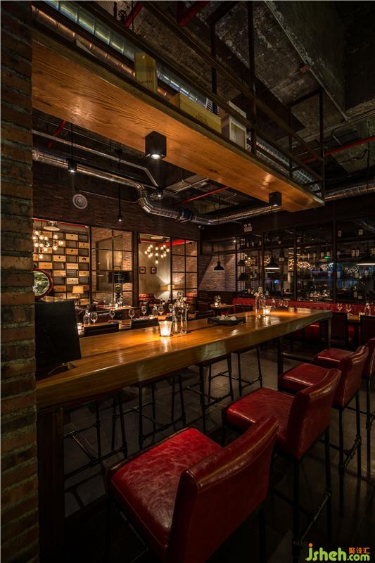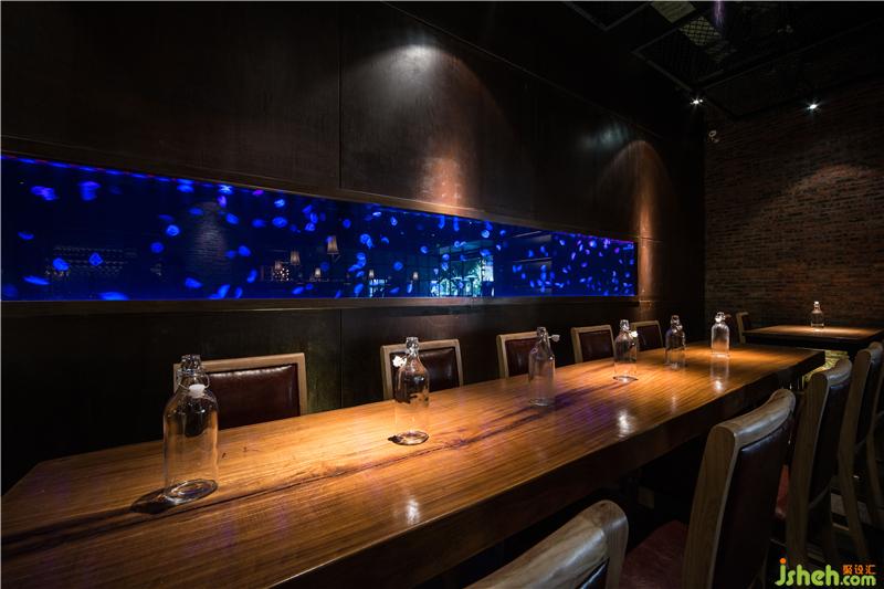 本案的設(shè)計(jì)概念意在打造一個(gè)“懷舊情懷”意式海鮮紅酒餐吧;設(shè)計(jì)師恢復(fù)了原建筑的混凝土肌理,以表達(dá)對(duì)一個(gè)空間歷史痕跡的懷念,空間的構(gòu)造簡潔明快,銹板和紅磚很好地與原有的混凝土肌理結(jié)合在一起,加上空間上裸露的空調(diào)風(fēng)管和消防管,形成一種強(qiáng)烈濃郁的LOFT工業(yè)質(zhì)感。餐廳頂部設(shè)計(jì)師為了讓鯊魚在“天上”暢游,設(shè)計(jì)了一個(gè)16米長大魚缸;讓客人在戶外用餐能有一個(gè)很特別的焦點(diǎn);而在觸摸到的實(shí)木臺(tái)面和酒柜和舒適有富有質(zhì)感皮革家具能給客人帶來一個(gè)溫暖而有品質(zhì)的用餐體驗(yàn)。