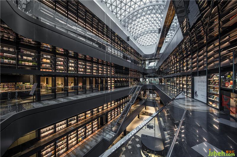 一樓到四樓,南面延伸至北面,在漫灑的天光映襯下,巨匯設(shè)計(jì)置入了兩道量體書(shū)墻,層高18米、全長(zhǎng)240米的尺度為全中國(guó)之最,使喧鬧的商業(yè)空間卻有著殿堂般儀式性的感動(dòng)與震撼。