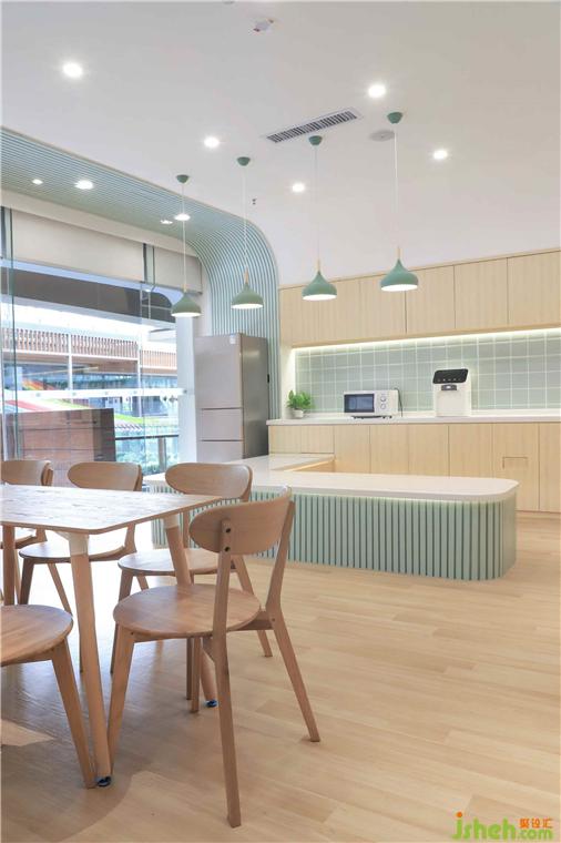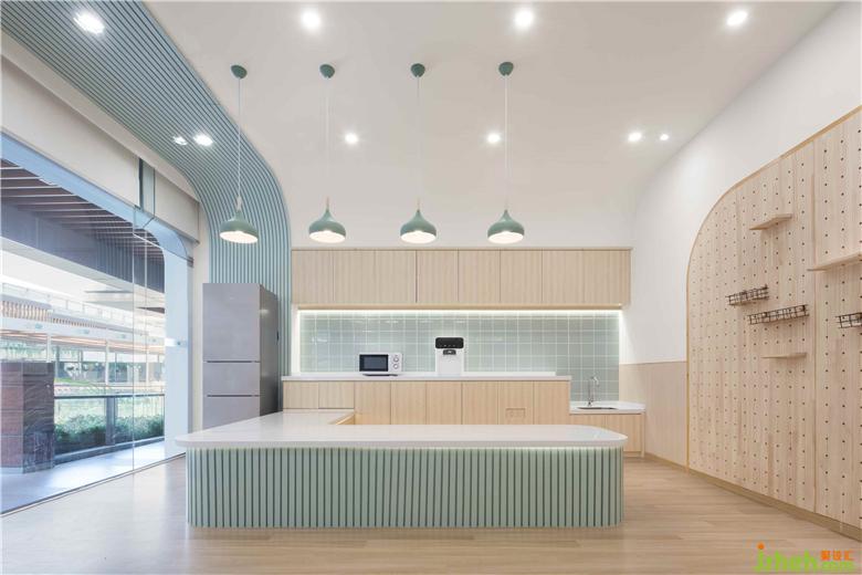 為孩子設(shè)計(jì)的廚藝教室,特意設(shè)置符合老師、孩子身高的高低臺(tái),方便老師、孩子操作。吊柜和儲(chǔ)物柜幫助老師收納物品,保持空間整潔與干凈。