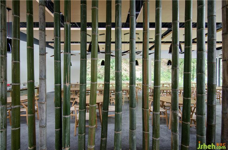 開放餐廳有兩根原始鋼結(jié)構(gòu)柱呈東西向布置,我們在兩根柱間將就地取材的天然竹子用鋼索吊裝于天花板上部形成隔斷,竹子底部則成曲線形懸空。清風(fēng)徐來,翠竹微擺也別有一番情趣。