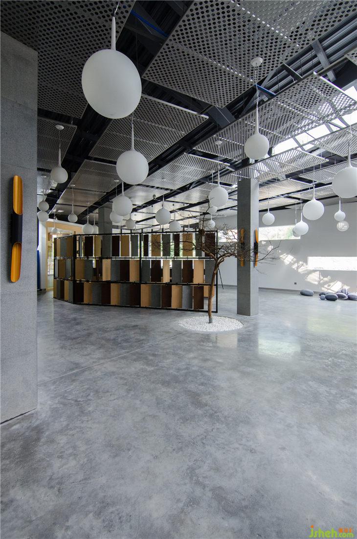室內(nèi)頂面穿孔金屬板將無序的天花結(jié)構(gòu)及管線設(shè)施在視覺上做了一個整理,既讓天花能形成良好的統(tǒng)一感,又不妨礙頂部的采光天窗將光線引進(jìn)室內(nèi),圓孔的處理在室內(nèi)形成了特殊的光影效果。銀色的反光金屬板材質(zhì)在視覺上也具有輕盈性。以此可在空間上建立起一種新的秩序。
