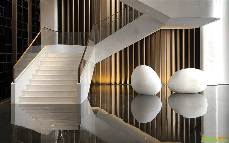 The hotel space follows the traditional philosophy that circle is dynamic and square is static. The space environment pursues the realm of "harmony between man and nature". All the exquisite and ingenious designs are for the perfect combination of man and environment, so that the guests can feel the tranquility of life in the artistic aesthetics, stay away from the hustle and bustle, empty themselves here, and enjoy the harmonious beauty infinitely. The theme of the hotel is water. The artistic conception of water, the background of water shadow, water drop, water bubble and undulating waves form a deep emotional connection with the guests. The theme of the hotel is water. The artistic conception of water, the background of water shadows, water droplets, blisters, and undulating water waves form a deep emotional connection with the guests. In terms of color, it follows the logic of "black is water" in the traditional five elements culture, refuses superficial decoration and does not cater to the trend. Through the main materials of Jazz white stone, royal brown stone, ancient copper plate, ancient copper wire drawing, crystal, designers created a water story.