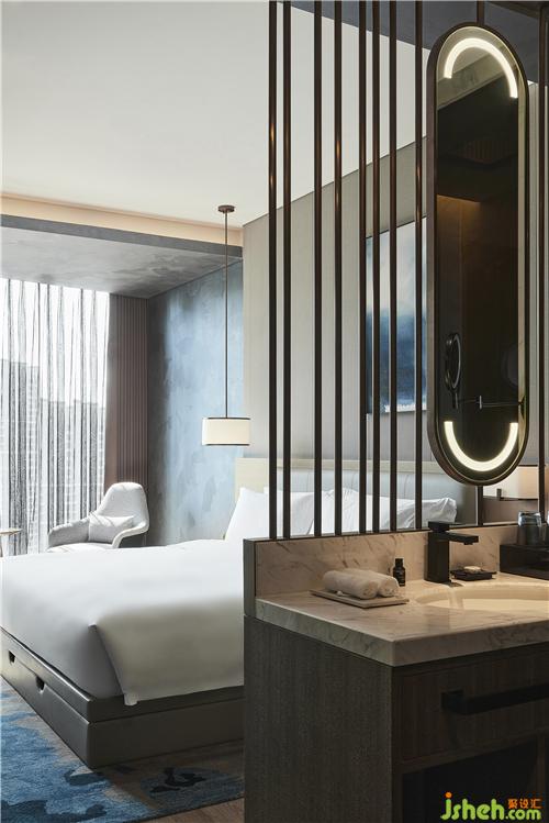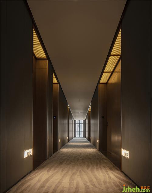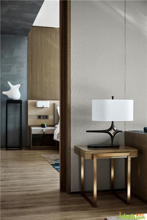 《桃花源記》的重點(diǎn)是“不知有漢,無論魏晉”。我們室內(nèi)設(shè)計(jì)延續(xù)“世外桃源”的意境,酒店平面設(shè)計(jì)曲徑通幽、歩移景換,在狹窄靜謐的入口玄關(guān)等待徐徐平移打開的酒店大門,同時(shí)也是在等待一曲抑揚(yáng)頓挫的優(yōu)雅的酒店“水”故事樂章的開始。大門完全敞開后,展現(xiàn)給客人的是比玄關(guān)更高大和恢宏的酒店大廳,先抑后揚(yáng)的空間節(jié)奏,在這里得到了完美的體現(xiàn)。隨后呈現(xiàn)給客人的是受宋朝范寬《溪山行旅圖》氣勢(shì)磅礴構(gòu)圖啟發(fā)的服務(wù)臺(tái)背景。酒店大門正對(duì)面是一個(gè)屏風(fēng),隔而不斷,承前啟后,在交通中心的大堂僅一線之隔就創(chuàng)造出一個(gè)安靜、酒店設(shè)計(jì)優(yōu)雅的大堂吧休閑社交空間。像中國(guó)園林一樣充滿了變化和驚喜。酒店室內(nèi)用材分區(qū)明確、整體,用材冷暖恰當(dāng),和諧統(tǒng)一。保持獨(dú)特的風(fēng)格,鮮明的水主題,優(yōu)雅祥和的氛圍,力求在每個(gè)客人內(nèi)心中創(chuàng)造一個(gè)世外桃源,并且,可行,可望,可居,可游。