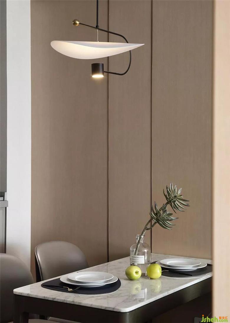 黑白金色組成的吊燈,為小巧的餐廳平添精致摩登感。